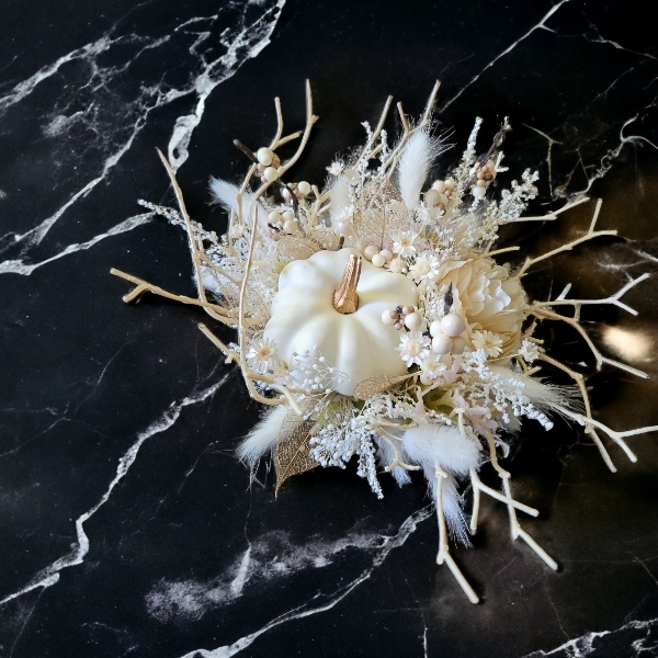 アーティフィシャル素材の枝の器に、カボチャ、ラナンキュラス、ラグラスやシャワーグラスなど、優しい白色の花材をたっぷりと詰め込みました。