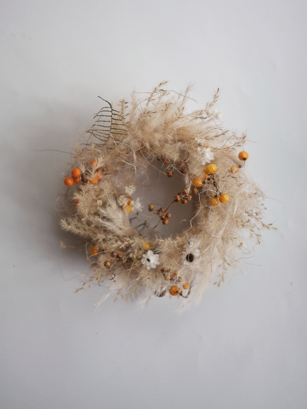 リースやブーケの中にストーリー性があり、草花が風にゆれる自然の景色をそのまま切り取ったかのような作品づくりをしています。