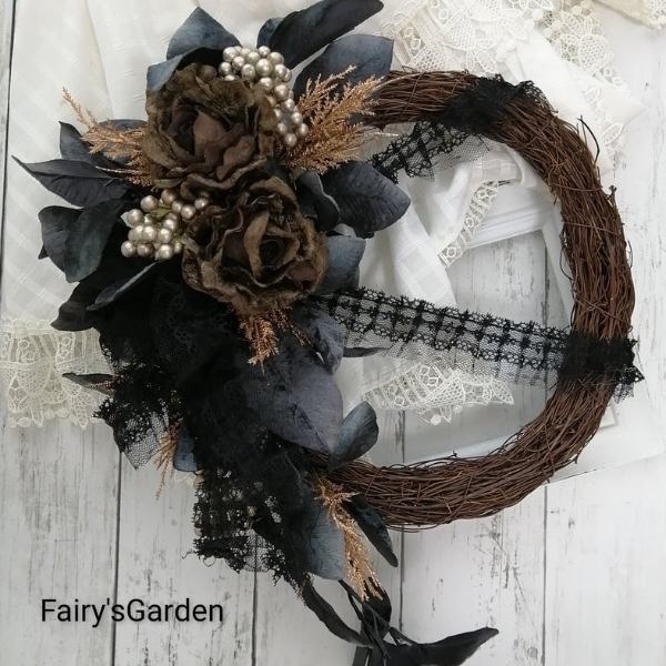 大人っぽい中にも可愛らしさがあるゴシック風のハロウィンリース。