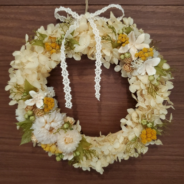 ほんわかした黄色のリースが欲しいとのご要望だったので、淡い色合いのダリアやラスカスとかも優しい色のスプリンググリーンを使いました。