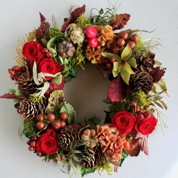 紅葉したニガイチゴのドライに合わせて真っ赤なバラ、ケイトウ、サンキライやバラの実などをあしらったミニリース。