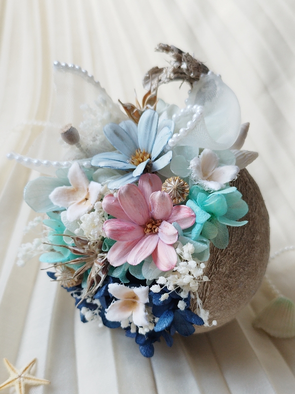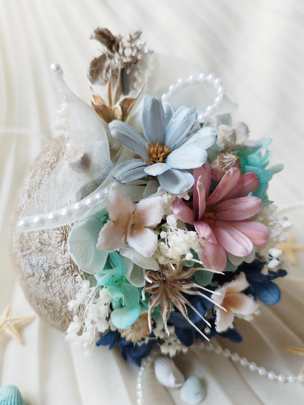 プロポーズが「海」だったそうで、2輪のお花を新郎新婦様に見立て、紫陽花のブルーで海のグラデーションを表現しました。
