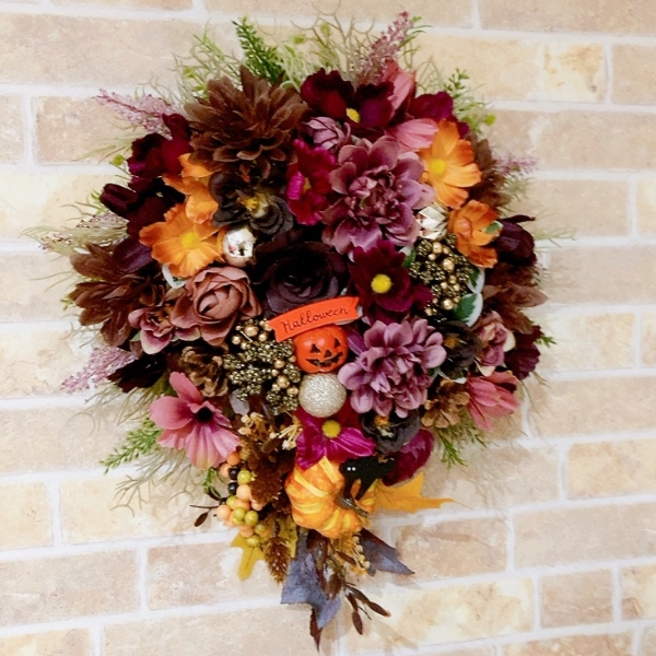 沢山のミックスグリーンをベースにショコラローズ、アンティークダリア、コスモス、松ぼっくり、ブラックベルベリー、オーナメント、カボチャ、黒バラなどををたっぷりと使い、大人可愛いハロウィンリースに仕上げました。