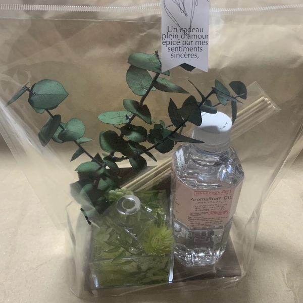 作品、リードスティック、アロマオイルとセットにして贈り物にしました。