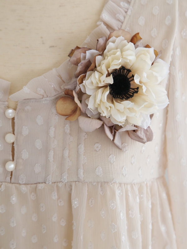 たくさんの花びらが美しいアネモネと、ドライフラワーのようなアジサイを使いアンティークなイメージで仕上げたコサージュです。