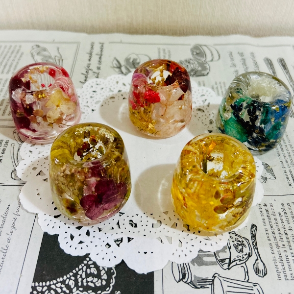 プラスチックの型に、ドライフラワーやネイルで使う素材を入れて、2液性レジンで固めました。