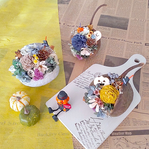 秋色のお花やカボチャを詰めて、お花の間から覗くウッドチップのお化けちゃんたちがポイント!