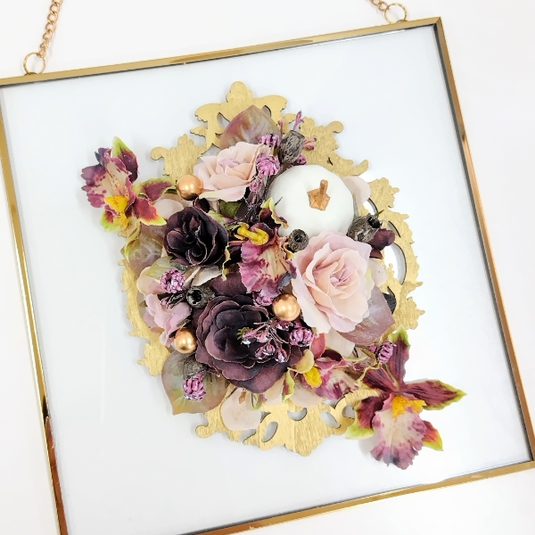 浮遊感のあるガラスフレームに、アンティークカラーのアーティフィシャルフラワーをあしらいました。