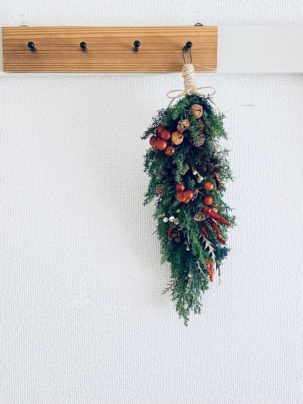 プリザーブドグリーンとトウガラシ、木の実を小さく束ねたものをつないでガーランドにしました
