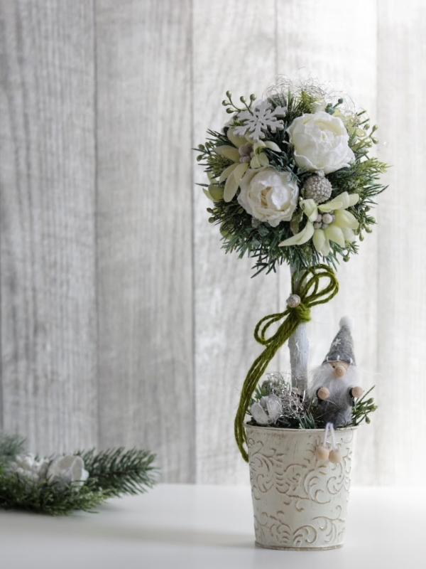 クリスマスには欠かせない『エバーグリーン』を表す針葉樹に、雪や氷をまとったようなお花を合わせたクリスマスのトピアリーです。