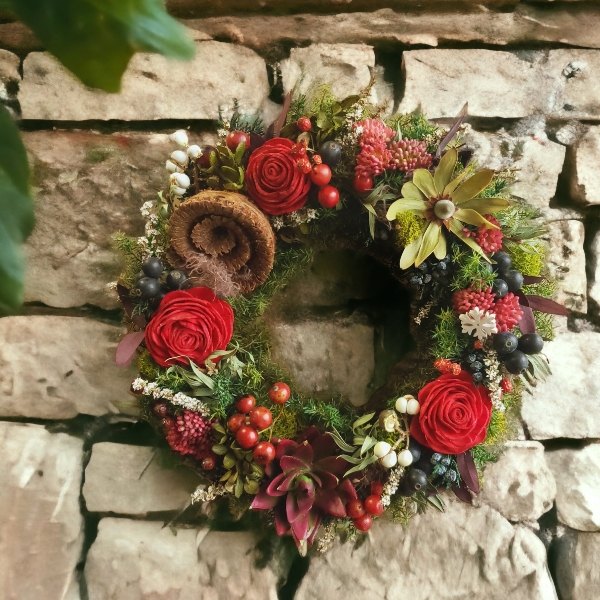 ヒムロスギ、マウンテンジュニパーなどのオーソドックスなベースに、シープホーン、リューカデンドロン、エケベリアやティーツリーの花などをあしらったちょっぴりワイルドなイメージのドアリースです。