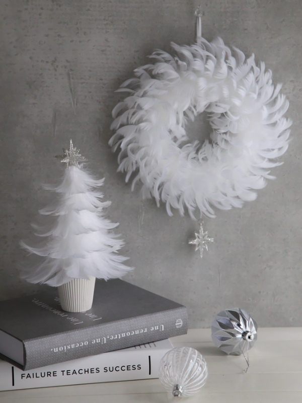 真っ白でふわふわのフェザーを使用したミニツリーとリースです。