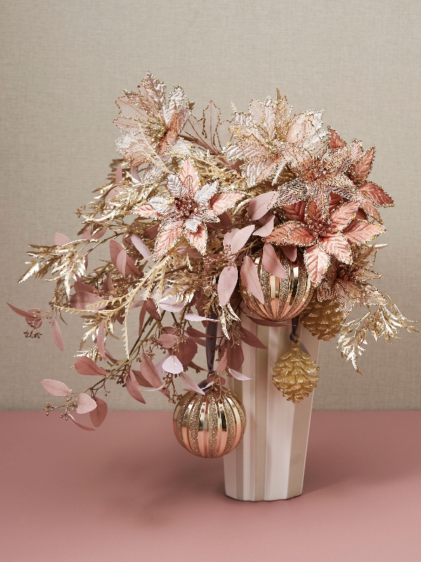 美しいピンクベージュとシャンパンゴールドを組み合わせたアレンジ。メッシュ素材やベルベットで出来たポインセチアを生かす様に同色のリーフやオーナメントでまとめます。ポインセチアのジュエリックな縁取りやラメなどで、スポットライトでより美しく輝きます。