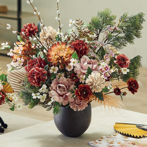 東京堂がお正月向けにおすすめする秋冬の新商品、艶やかな晴れ着姿を思わせるような羽衣シリーズを使った和のアレンジメント。