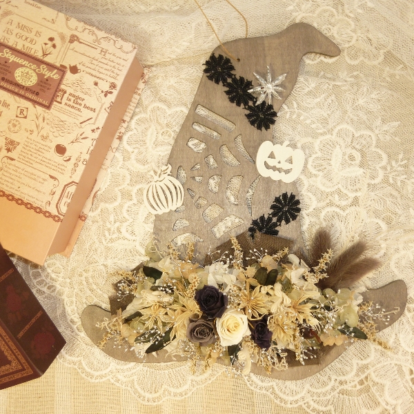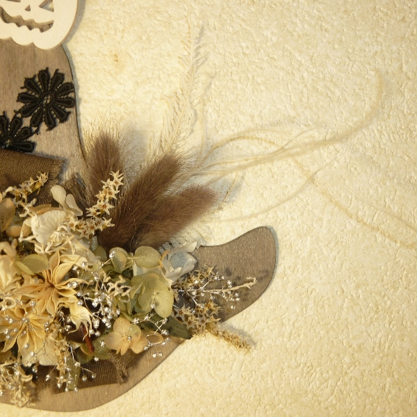 帽子型の木製ベースにリボンやレースモチーフを飾り、モノトーンでまとめた壁飾り。