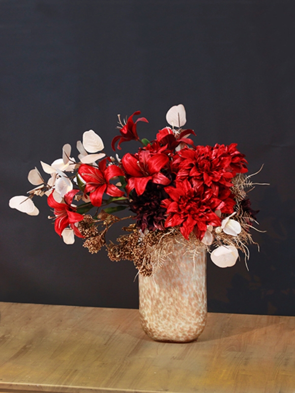 「お正月ベルベットアレンジメント」をご紹介いたします。この美しいアレンジメントは、伝統的なお正月の雰囲気と、豪華でモダンな要素を見事に融合させたものです。