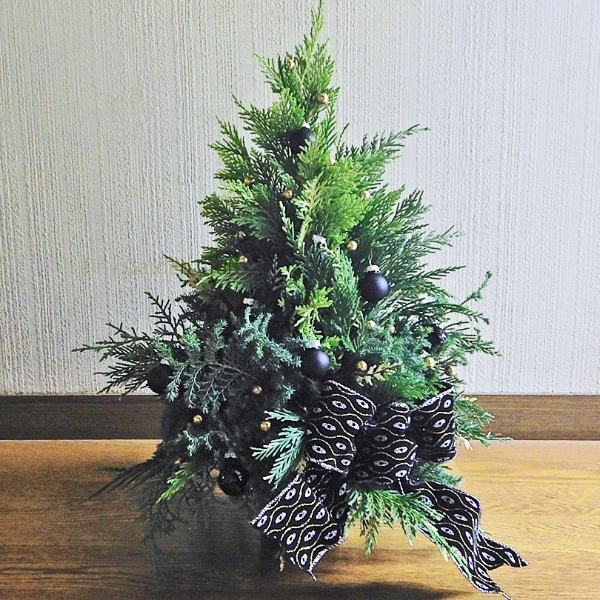 レッスン用の針葉樹を使ったテーブルサイズのクリスマスツリーです。
