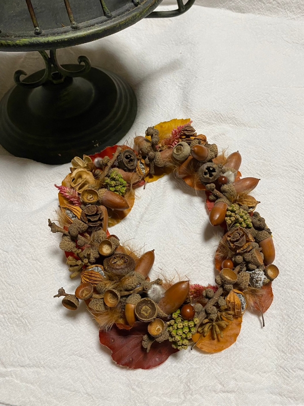 色づいた葉のプリザーブドフラワーを敷いた上に、いろいろな木の実を敷き詰めました。お部屋の中にも秋をどうぞ。
