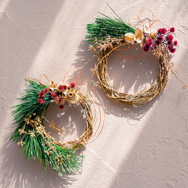 サンキライリースに松やペイント花材を飾りつけ。