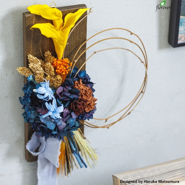 大地の豊かさを想像させるように、木製ボードとリースに使われるカールした枝をアレンジのポイントとしています。