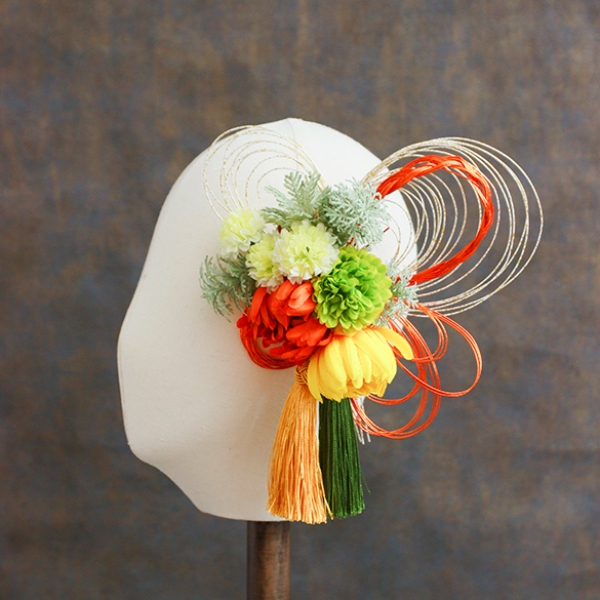 赤・緑・黄色の菊をメインとし、ポップで明るい雰囲気の髪飾りです。