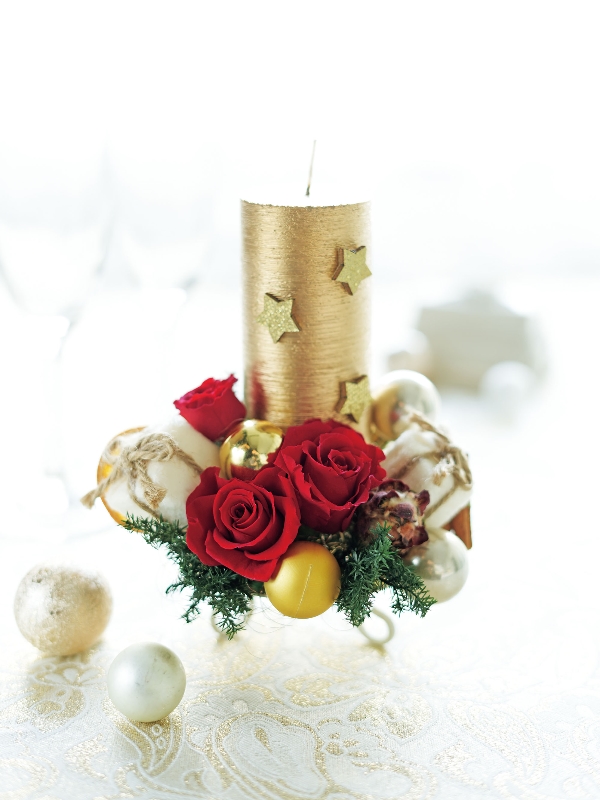 チェリーレッドのバラを装ったキャンドルアレンジを飾って家族で迎えるテーブルを華やかに。可愛いらしいオーナメントもいっしょに。