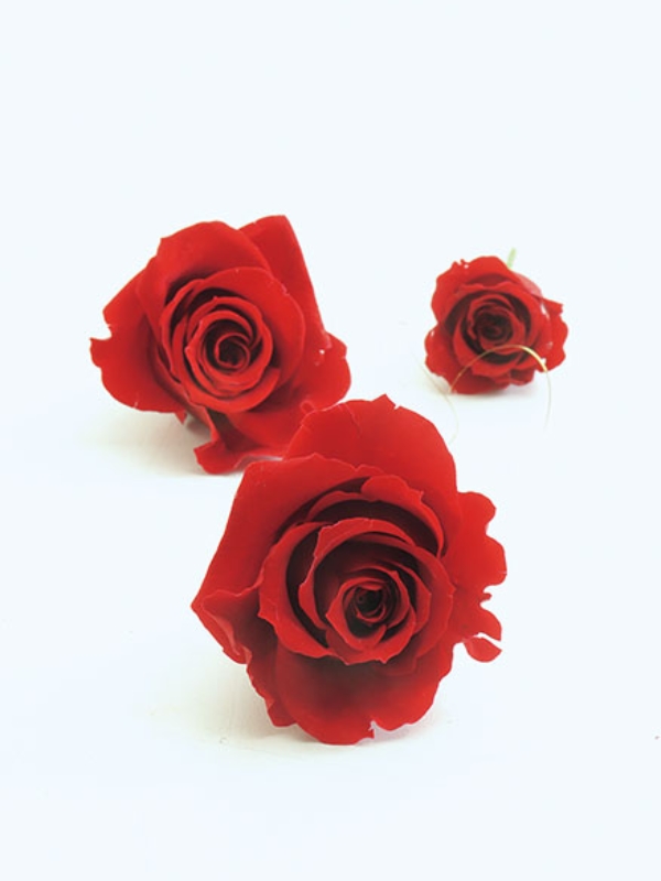 中輪のチェリーレッドのバラはブルーミング技法を使って開花。華やかな印象になるように。