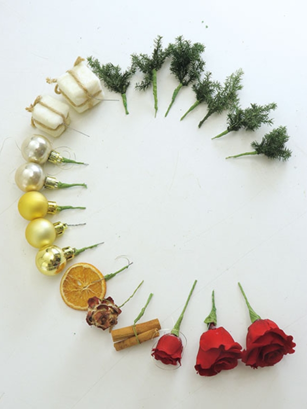 3 バラ、ヒムロスギ、実もの、シナモン、オーナメントなどをワイヤリング&テーピング。