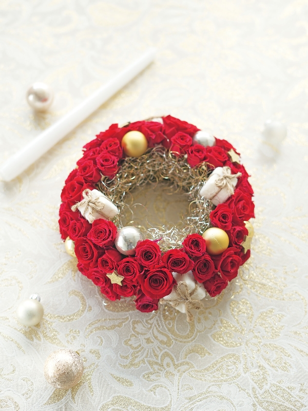 バラをたっぷりと使ったレッド&ゴールドの王道リース。少しぜいたくで、楽しさをプラスさせたプレミアムな装いです。
