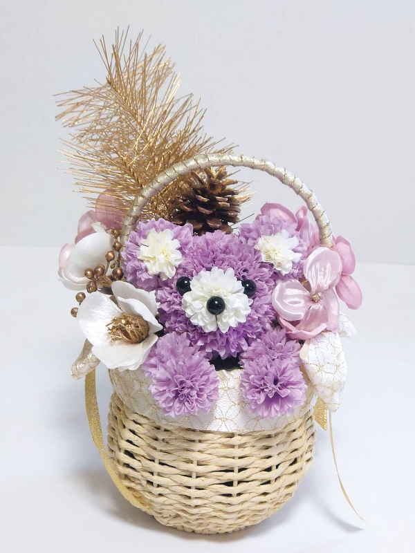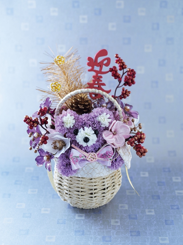 花テディベア®Cherishシリーズのお正月飾り。まるで新年のあいさつをしているような人気者のパープルベアさんから笑顔をもらえそう。
