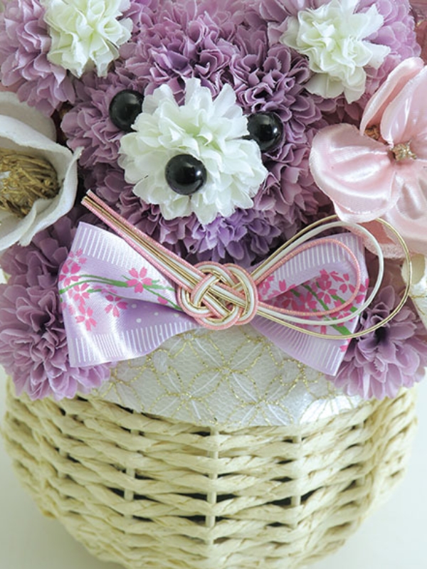 5 花テディベア®の胸元にリボンと水引を装飾。