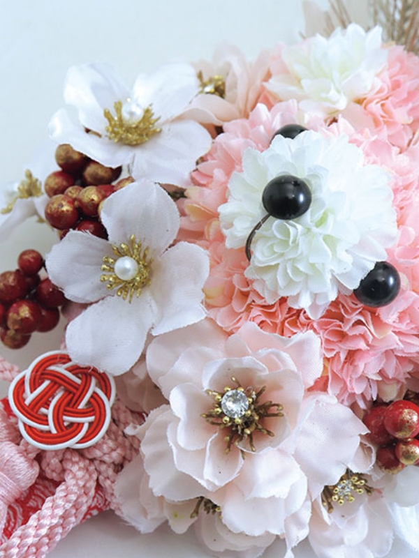 フェイクの花の花芯にはパールやラインストーンをつけてキラキラ感をプラスさせて。