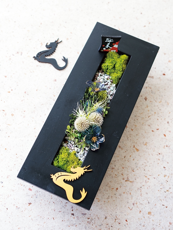 和の心を伝える「和苔」を使ったお正月の癒しのアレンジを提案。日本庭園を切り取ったようなフレームアレンジで雅やかな印象を与えて。