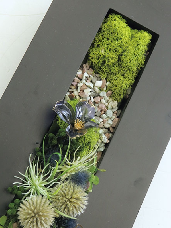 黒のフレームに、コケ、小石、緑を区切って配置させ日本庭園を切り取ったようなデザインに。
