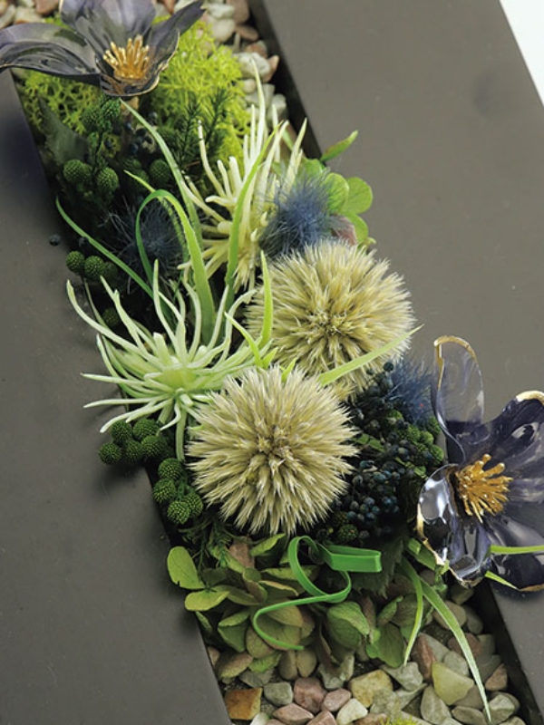 小石は川に見立て、ルリ玉アザミは中高に挿して自然の美しさが感じられるように。