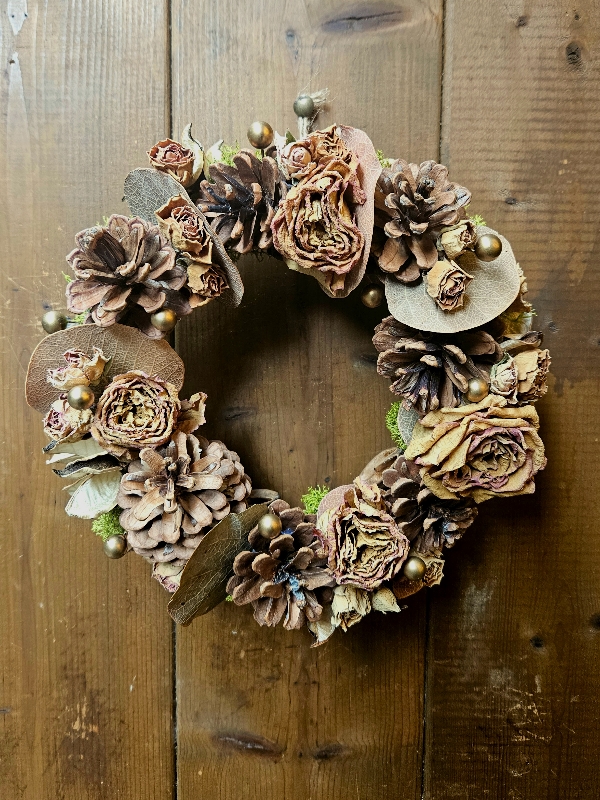 優しい風合いに色褪せた大輪のバラをふんだんに使用して、マツボックリとユーカリを合わせました。