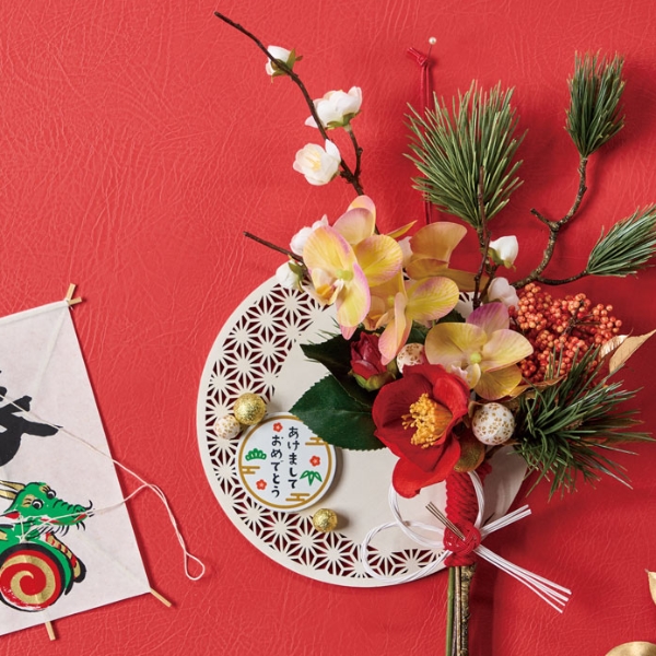 お正月らしい彩り豊かな資材を配して水引で飾れば、年神様も思わず笑顔になるような仕上がりになりますよ。(H)