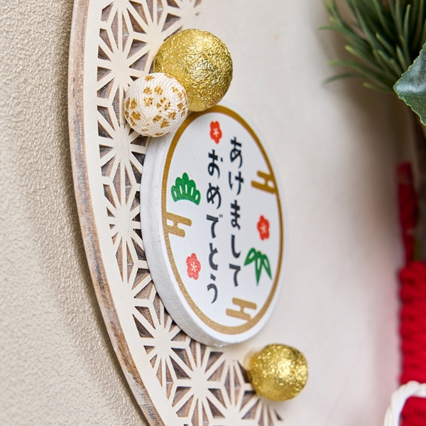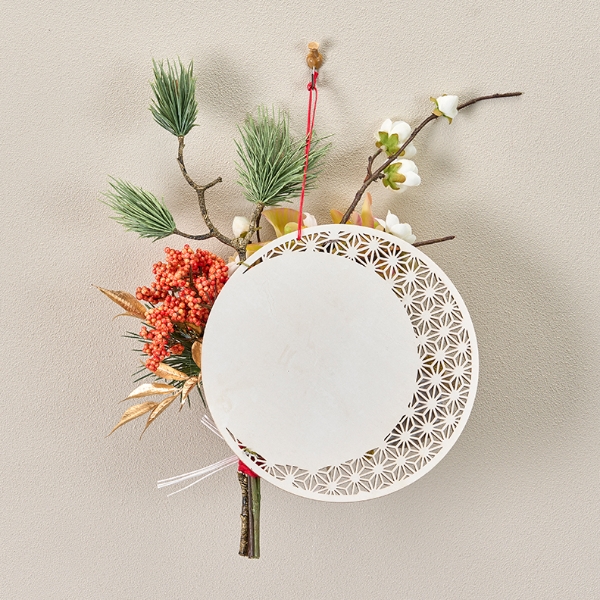 麻の葉模様の透かしがあるまあるいウッドプレートにお正月らしい
