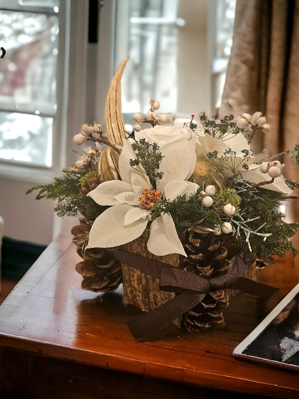 フローラルフォームの周りに笹の葉、マツボックリをリボンでまとめたものを器にしております。