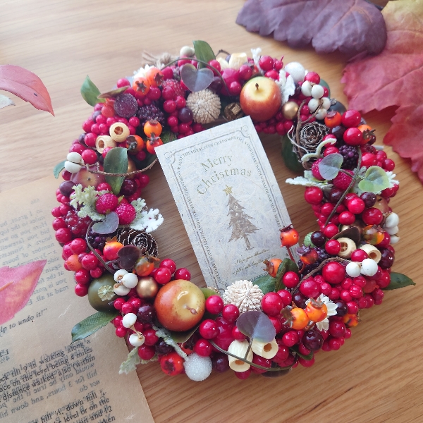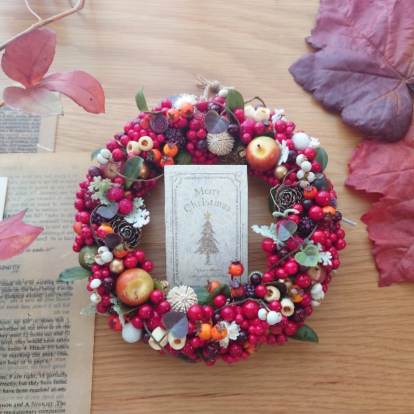フェイクのアップル、ベリーやドライの実をふんだんにつかったつぶつぶ、可愛いらしいクリスマスリースに仕上げました。
