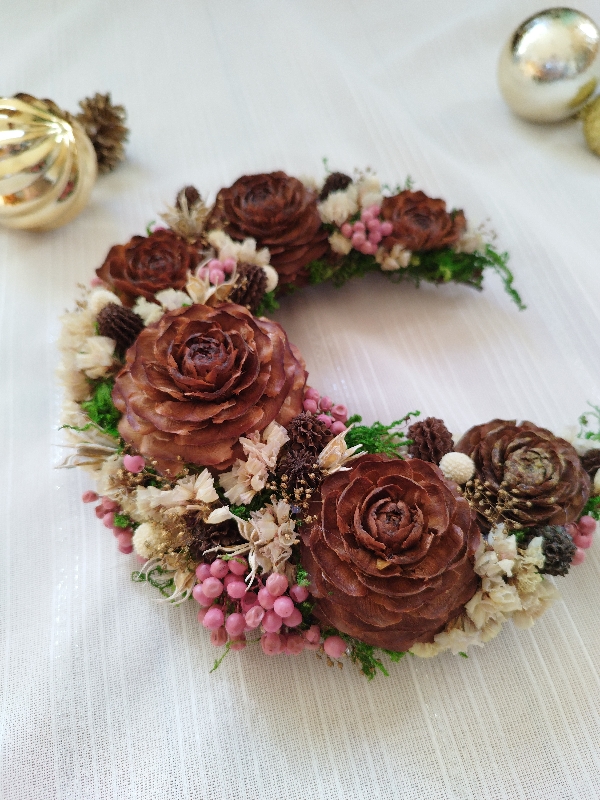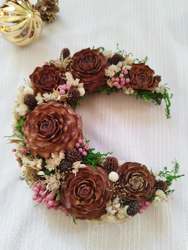 お月様の形をしたリースに、シダローズを大胆にアレンジしました。