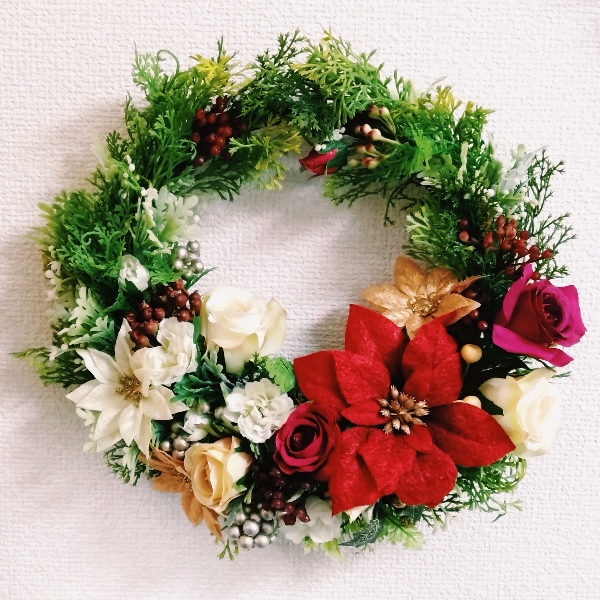 ローズやポインセチアで華やかさはありつつ、どこか素朴なあたたかさを感じるように少しナチュラルなリースに仕上げました。