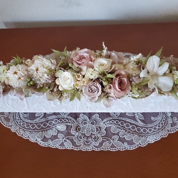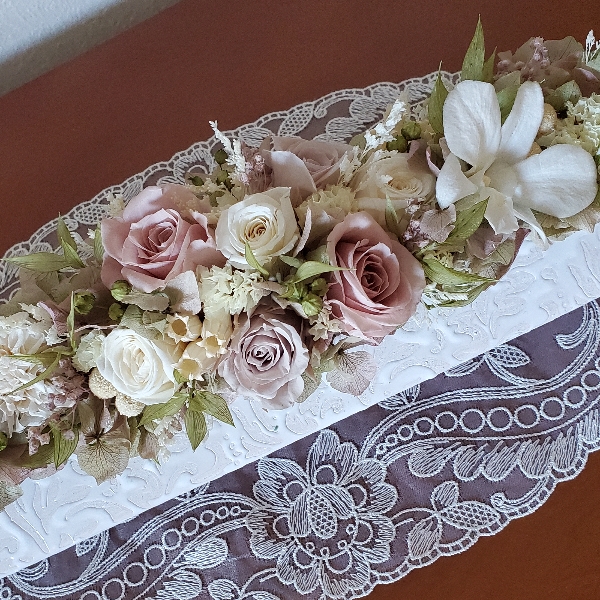お友達へのお供えとしてご依頼をいただいたので、あまり華美にならず、かつ、あまりくらい雰囲気にならないように、優しい色使いで仕上げました。
