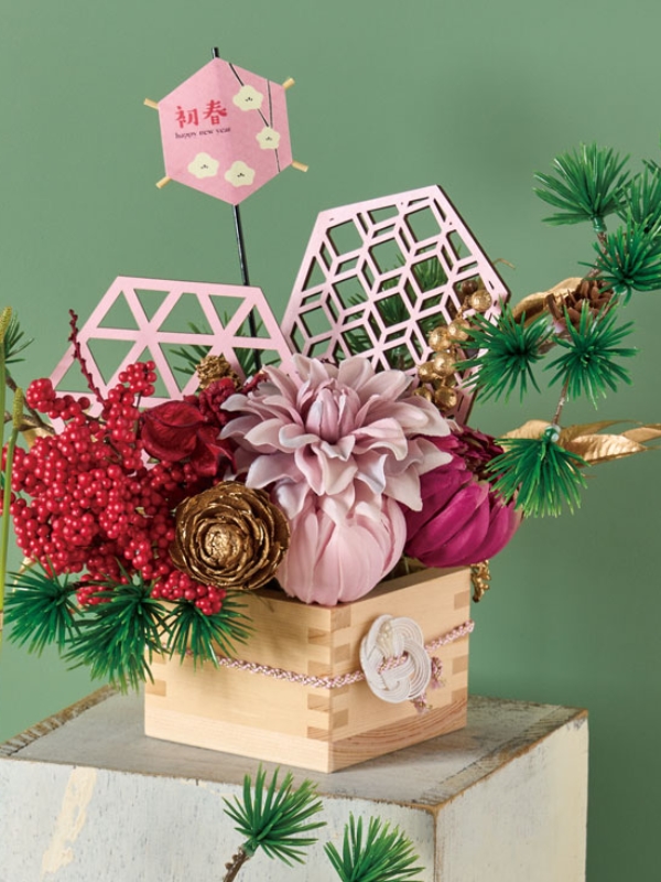 小さな枡からおめでたい資材が溢れんばかりのお正月アレンジ。