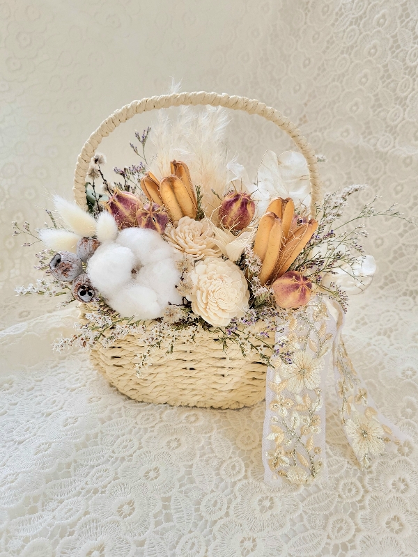 ドライフラワーのホワイトベージュ系のバスケットアレンジです!