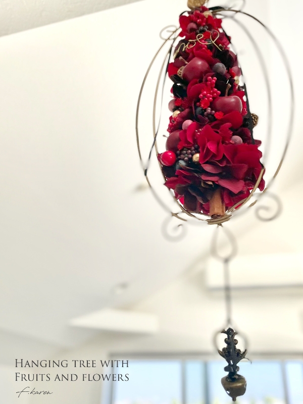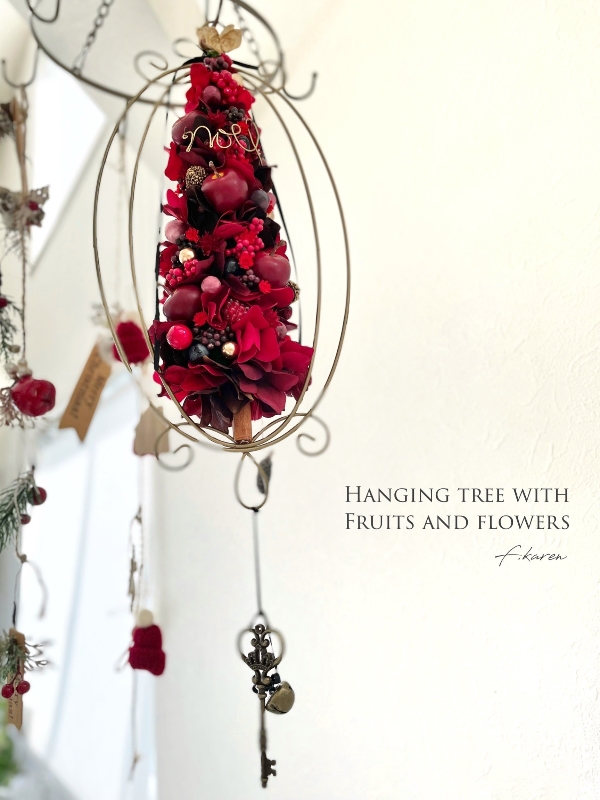 アップルやラズベリー、ブドウ等のフルーツと、お花や木の実を合わせた、大人レッドのクリスマスツリー
