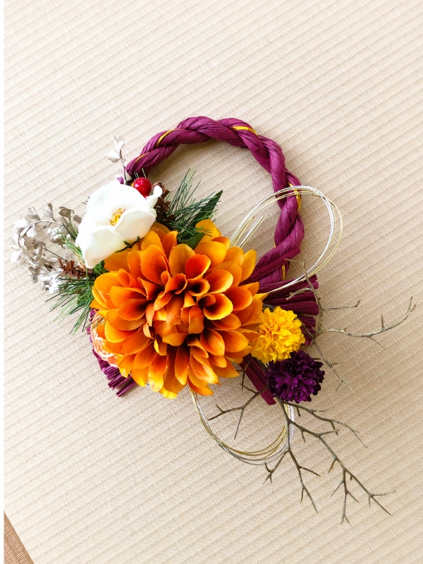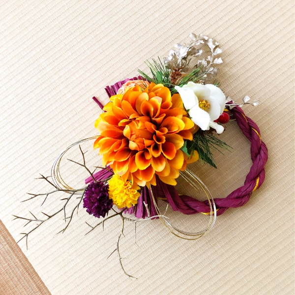 眩しい程明るいダリアのカラーを引き立てたしめ縄です。
