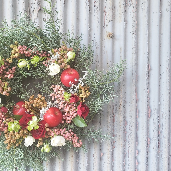 かわいいピンクペッパーベリー、ミニリンゴで彩りを。