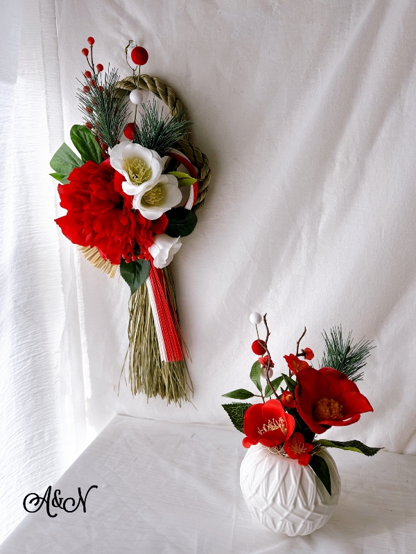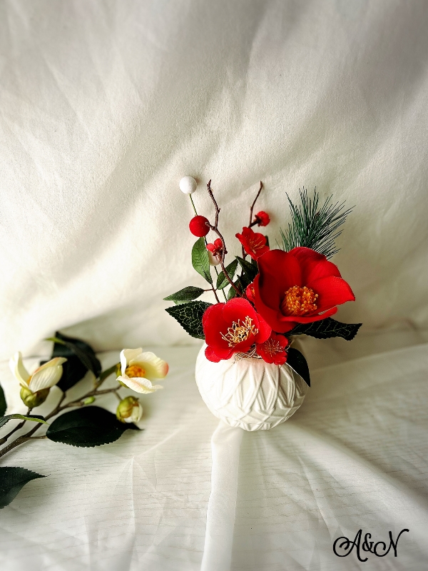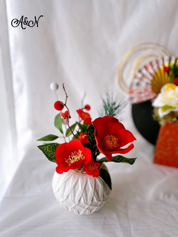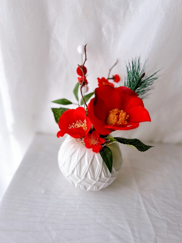白色の鞠のような丸い陶器に、椿を中心に凛とした正月飾りを作成しました。全て、アーティフィシャルフラワーですので、毎年飾っていただけます。