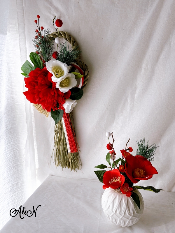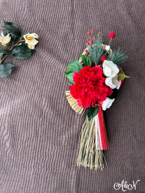 重ねふた輪、わら飾りを使い、大輪のピオニーを中心に和で仕上げました。紅白の水引き結びを使い、より華やかに仕上がりました。